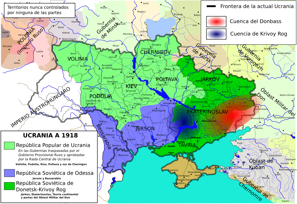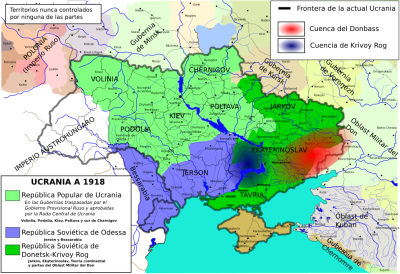 | Division of territories between the (bourgeois) People’s Republic of Ukraine, the Odessa Soviet Republic and the Donetsk-Krivoy Rog Soviet Republic in early 1918. |
