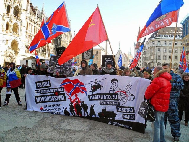 | Munich, Germany: Anti-fascists protest Ukraine’s Western-backed war on Novorossiya outside Munich Security Conference, February 7, 2015. Photo: Antiimperialistische Aktion |