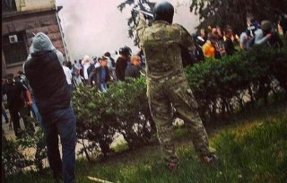Well, we thought we’d preserve the defenses, hold the line on that floor. It was a narrow space, and in a narrow space, as is well known, the number of defenders is not so significant. And so there we were, until after a while one of the ultras with a Ukrainian ribbon crashes in and says, “Oops, this is the end of you!” And beside me was an old grandfather. Maybe a former military man — he was wearing camouflage. Well, I respected this grandfather — he kept his head and immediately threw a punch at this fool. He hit him in the stomach so hard that he got up and ran away. And I was holding a large fire extinguisher. I took it in case we had to hold back the flames, it had very strong pressure. I sprayed him with the fire extinguisher, he scrambled up and fled, dramatically threw a bottle at us, but missed.