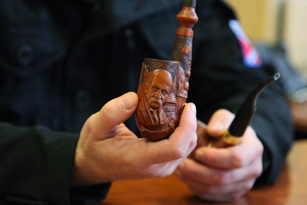 The brigade commander smokes a lot. On the table are his four pipes. Once, says Mozgovoi, he tried to quit, but failed. On one pipe is carved a portrait of Taras Shevchenko. A trophy.