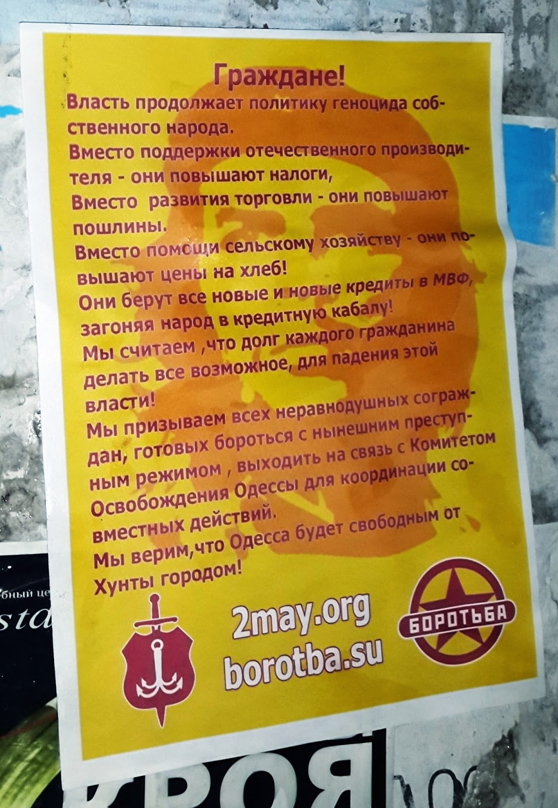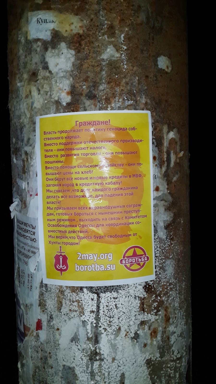 Posted on April 29, 2015 by allpowertothesoviets Despite the mass arrests Odessans are still struggling! On the evening of April 29, the city was plastered with leaflets calling for the overthrow of the current regime: Share this: Share on X (Opens in new window) X Share on Facebook (Opens in new window) Facebook Like Loading... Related