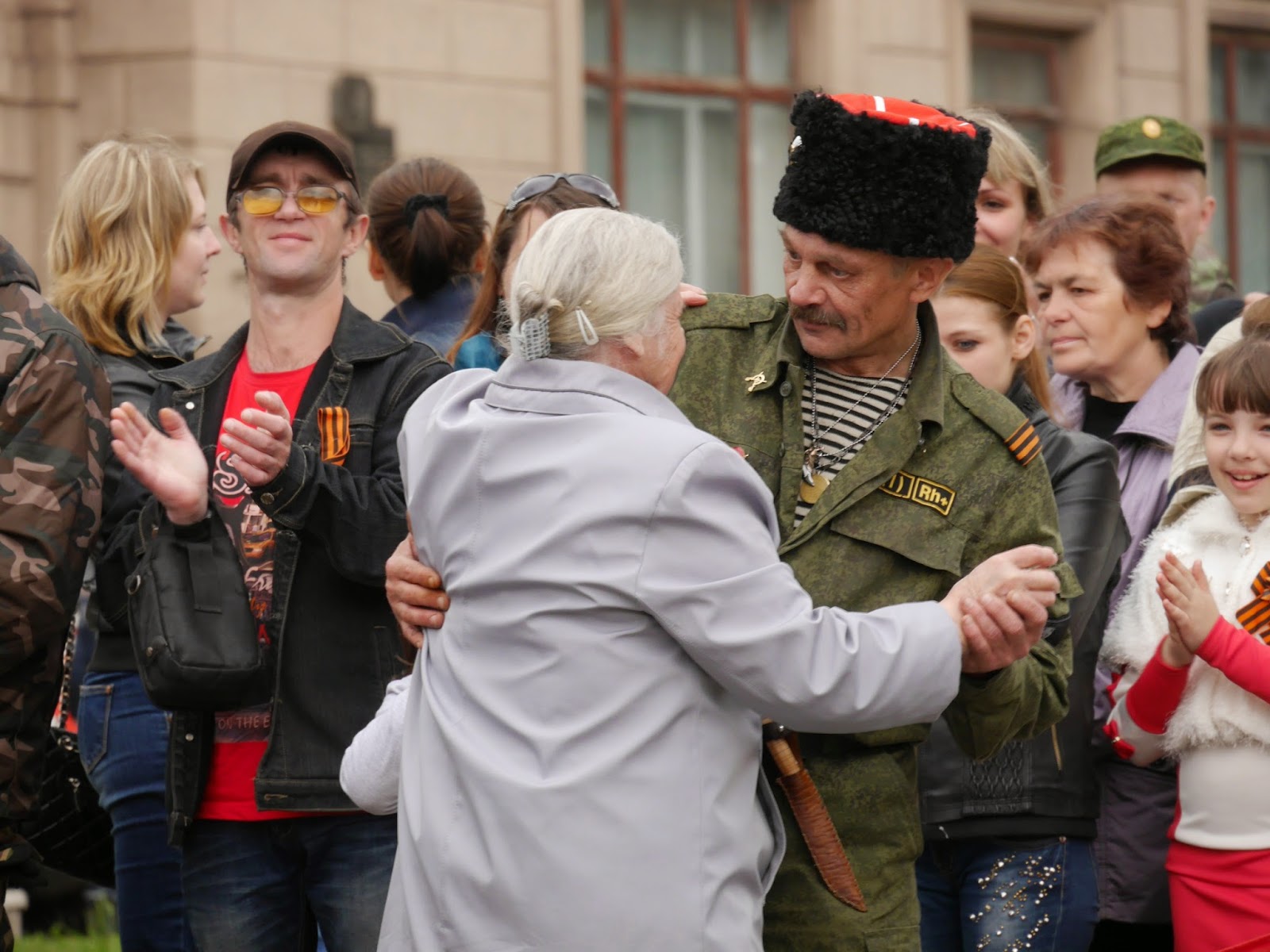Take a look at these frightened and grim faces of the unfortunate inhabitants of this city captured by Russian fighters, held at gunpoint and threatened with execution by firing squad, forced to portray the crowd on this hated holiday!