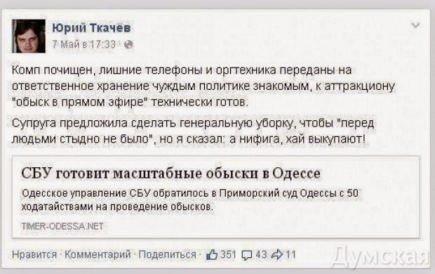 The home of Yuri Tkachev, chief editor of the Odessa online publication Timer, is being searched. Journalist Alexander Sibirtsev reported this on his Facebook page.