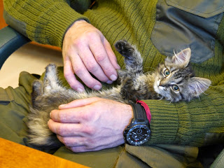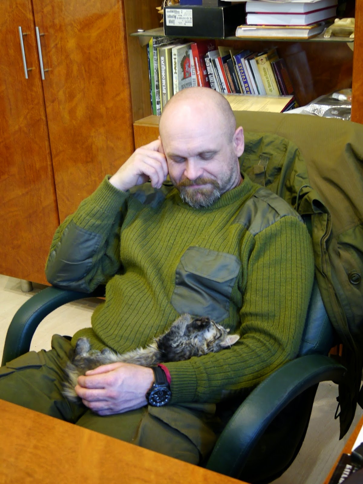 This photo was taken just a couple of days before the death of our Brigade Commander. The frantically meowing kitten, picked up during the rain, quickly became a universal favorite of the staff. He was allowed to roam on the table during meetings, suddenly attack from the rear, and sleep in the lap of the Brigade Commander. He even had his own bowl in the office of the First! But yesterday he was sitting alone in the empty office and could not understand why no one was coming to play with him?