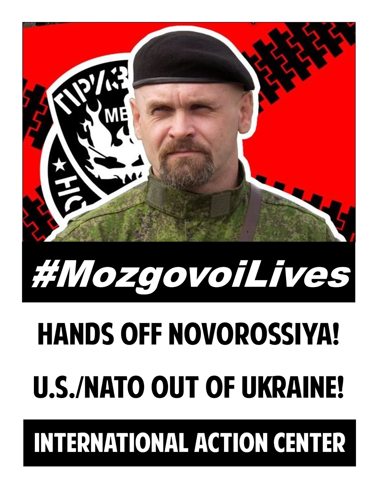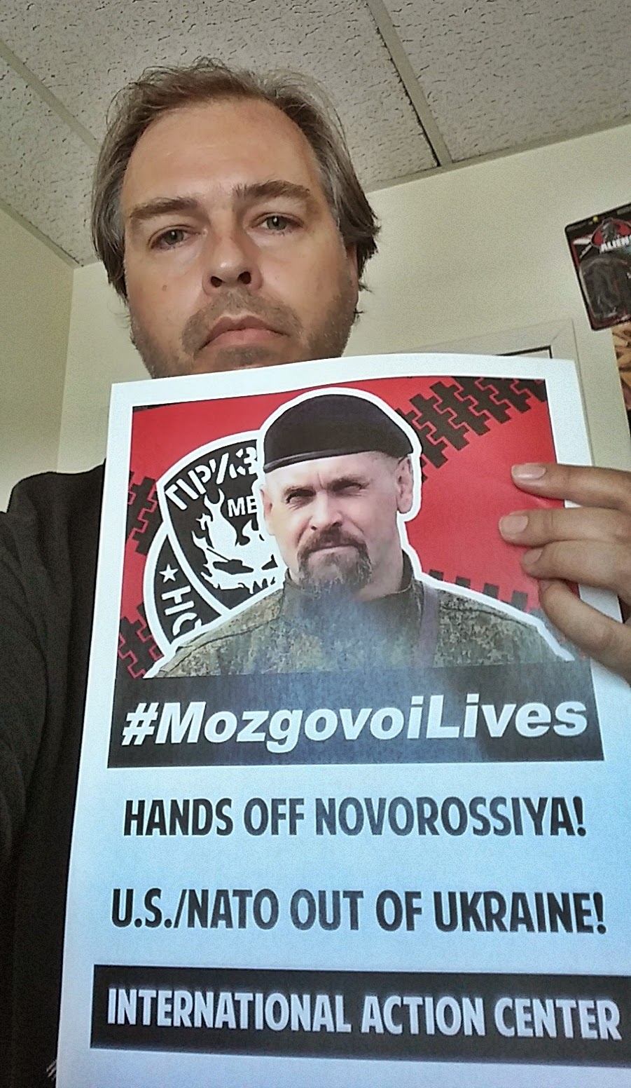 Download and print out the attached poster (8 ½ x 11” is fine), use your own, or make a handwritten sign that says: Stop the war on Donbass! U.S./NATO out of Ukraine! Include the following hashtag on the sign: #MozgovoiLives. Take a selfie or group photo if possible. Post the photo to the Facebook event page here: https://www.facebook.com/events/975197192512458/.