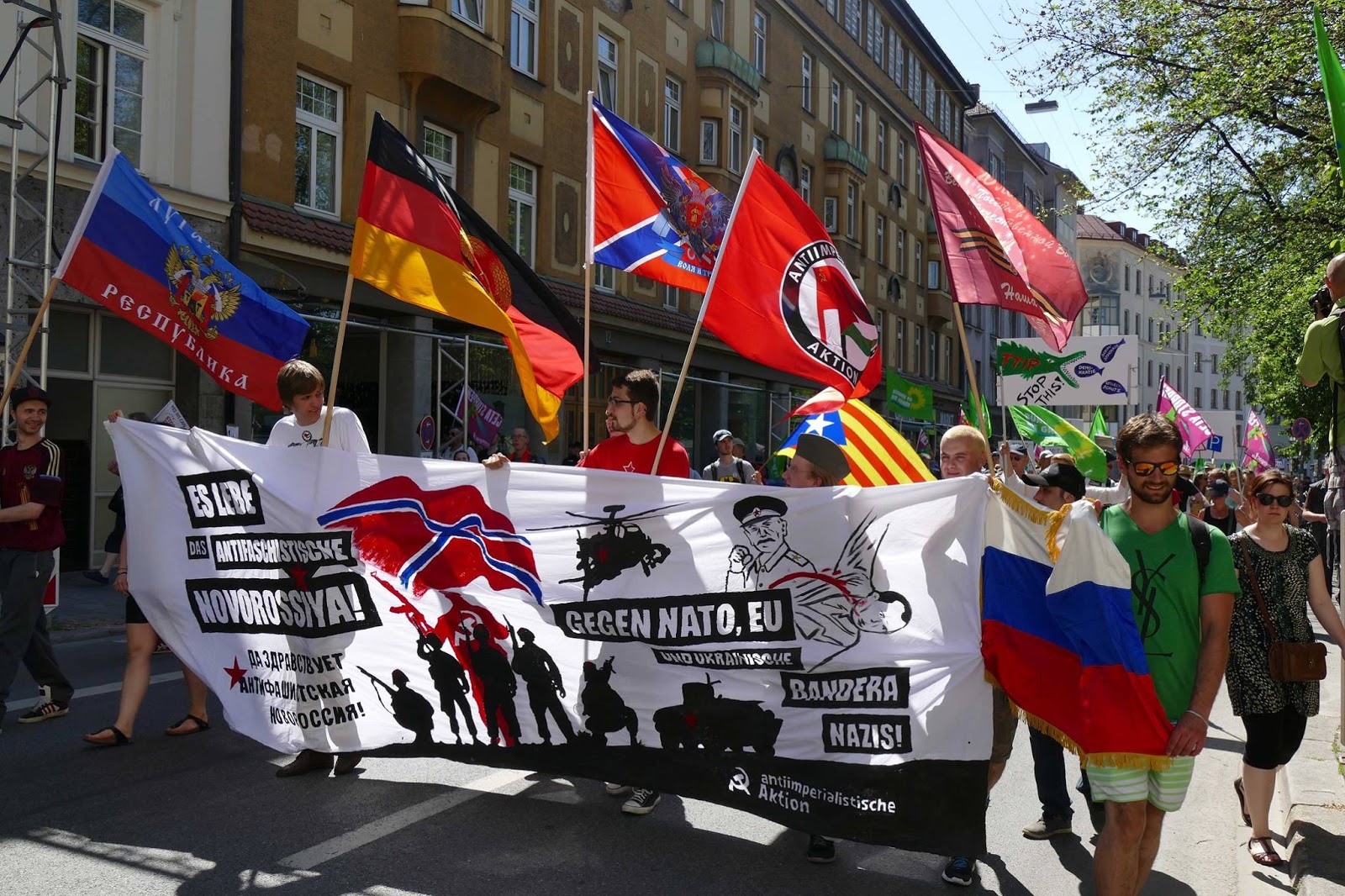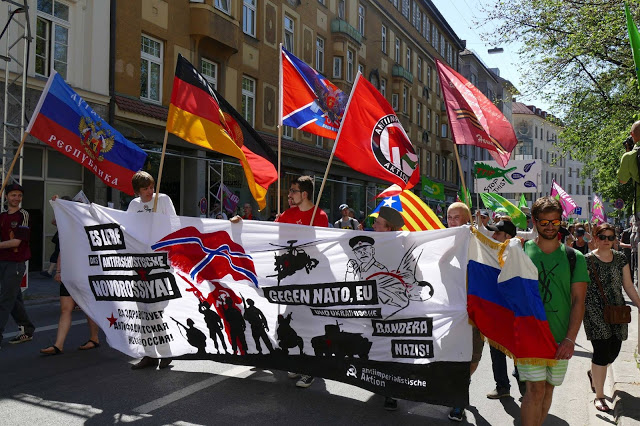 | Munich, Germany: Supporters of the Donbass republics march against the G7, June 4. Photo: Antiimperialistische Aktion |