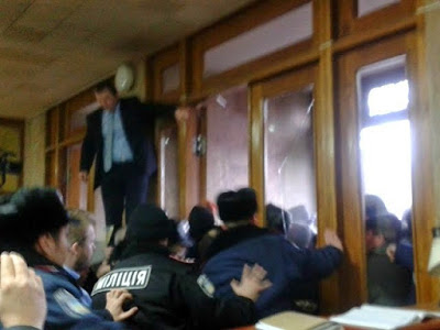 | Alexey Albu (upper left) trapped during police attack on protesters at Odessa Regional Council, March 3, 2014. |