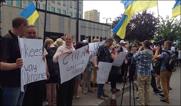 | Antiwar protesters at U.S. Embassy in Kiev demand “Yankee Go Home!” July 1, 2015. |