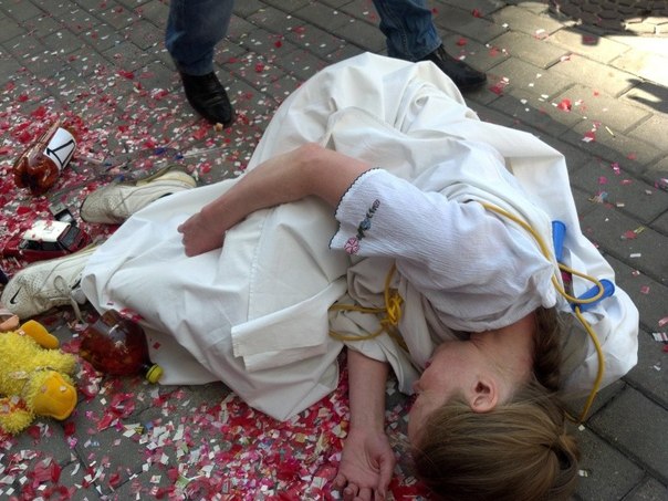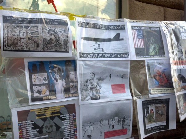 The bloody march of the U.S., ranging from a nuclear explosion in distant 1945 and ending in a bloody fratricidal war in the Donbass, was reflected on posters with the words “Vietnam”, “Syria”, “Libya”, “Serbia”, “Odessa” et al., where the bloody boots of American torturers and their satellites have stepped.