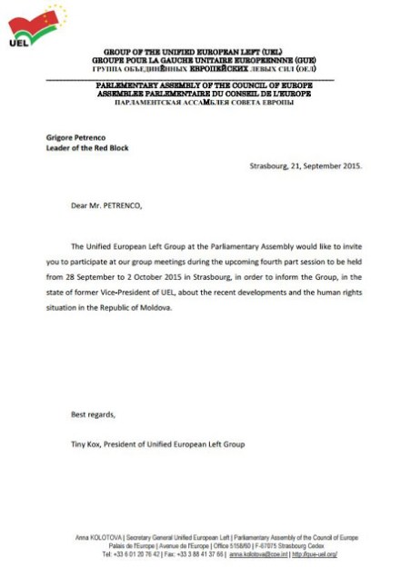 The invitation came from Chairman of the Group of the UEL Marinus Cox, who asked Grigory Petrenko to participate in the “meetings of the group in the fourth session from September 28 to October 2 in Strasbourg, as the ex-deputy chairman of the Group of the United European Left in PACE, to report about current development in the human rights situation in the Republic of Moldova.”