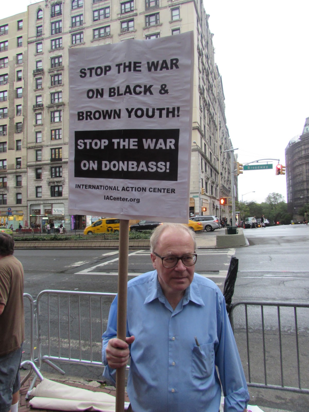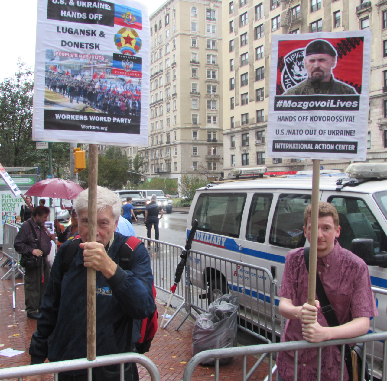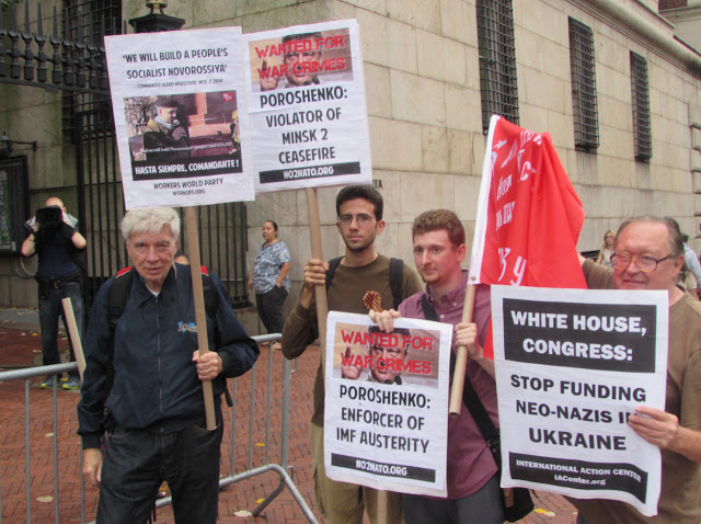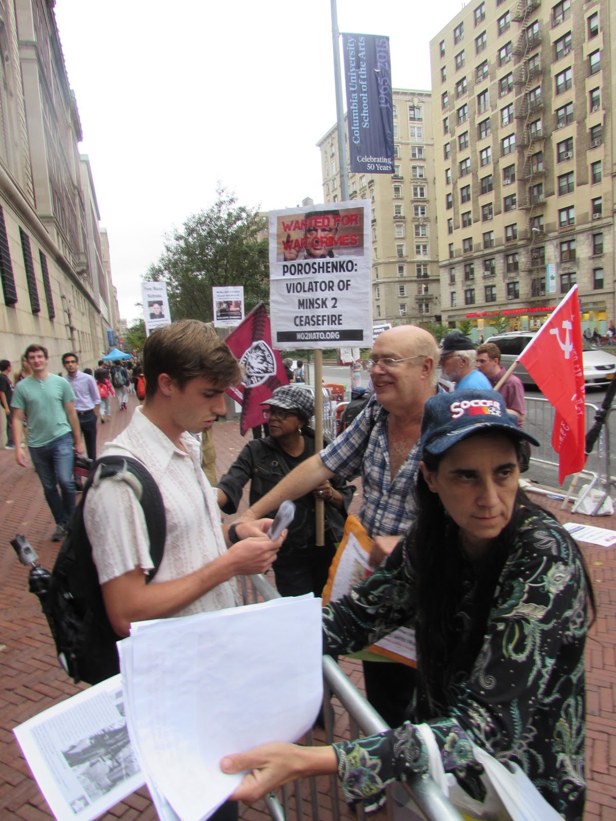 “We are here not only to condemn Poroshenko,” declared Greg Butterfield of the International Action Center. “We are here to condemn Columbia University President Lee Bollinger for giving this war criminal a platform to spread his lies about ‘Russian aggression’ in Donbass. We are here to demand that President Obama, Senator John McCain and other high officials in Washington stop funding and arming Poroshenko’s fascist junta.”