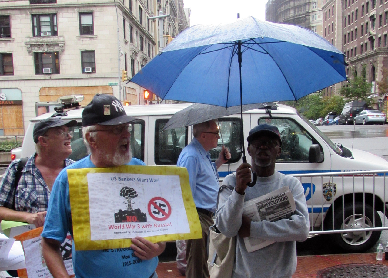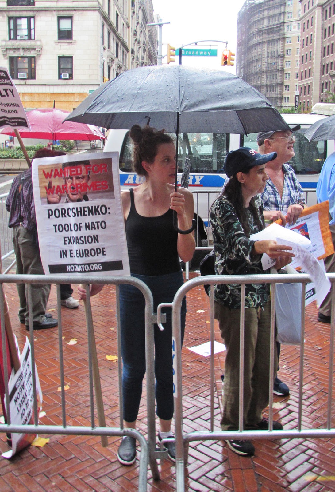 Undeterred by rain, New Yorkers came out to protest a speech by Ukrainian President Petro Poroshenko on the campus of Columbia University on Sept. 29. They loudly chanted: “U.S. out of Ukraine, fascists off the campus!”