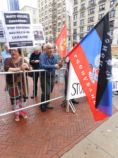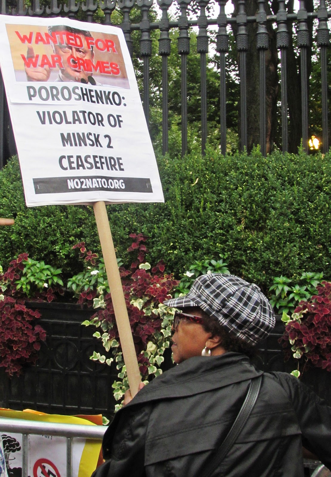 Signs and leaflets laid out the charges against Poroshenko: his responsibility for more than 7,000 deaths in the war against the independent Donetsk and Lugansk People’s Republics; forcing 1.3 million people to become refugees; jailing journalists and political opponents; banning communist ideology while celebrating fascist collaborators; violations of the Minsk 2 ceasefire agreement, including shelling and terror attacks aimed at hospitals, schools and other civilian targets; and acting as the agent of Wall Street and Washington to impose austerity and NATO expansion.