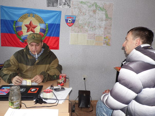 | Reporter Alexander Alexeyev (right) interviews Eugene Wallenberg at Ghost Brigade headquarters in Alchevsk. Photo: Recent News of Donbass |