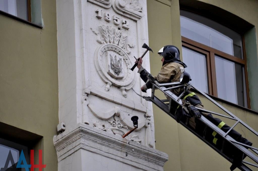 | As Kiev held bogus local elections, the Ukrainian trident was removed from a building in downtown Donetsk, Oct. 25. |