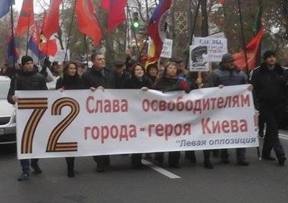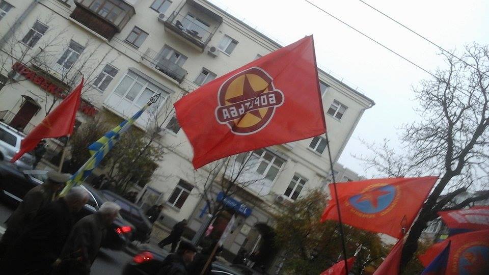 Although banned, activists of Borotba (Struggle) in Kiev, Ukraine, took part in the march and rally in honor of the Day of Liberation of Kiev from the fascist invaders on November 6.