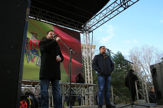 | Red Bloc interim leader Alexandr V. Gutovski (left) demands freedom for Petrenko Group political prisoners at a rally in Chisinau, Moldova, December 3. Photo: Alina Rutich |