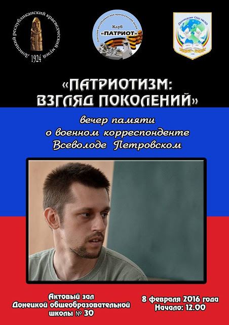 On February 8, 2016, at 12:00, members of Patriot Club of the Donetsk Regional Museum, dedicated to local history, will visit Donetsk Secondary School No. 30. At the school, a club meeting will be held on the theme: “Patriotism: A View of Generations.” Teachers and students of the school, along with members of the Patriot Club, will hold a memorial dedicated to graduate of the school and military correspondent Vsevolod Petrovsky.