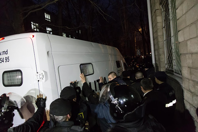 Outside, more than 1,000 protesters held an angry but peaceful demonstration, surrounding the courthouse and blocking traffic. Later, the protest was attacked by masked riot police carrying shields and swinging billy clubs. The protest continued late into the evening, eventually marching from the courthouse to Chisinau’s central square. (MoldNews.md, Feb. 15)