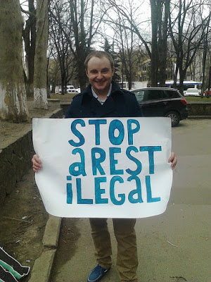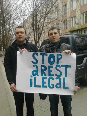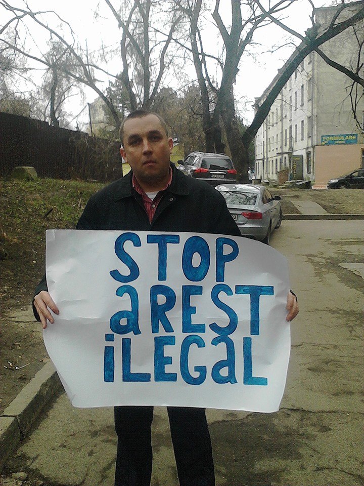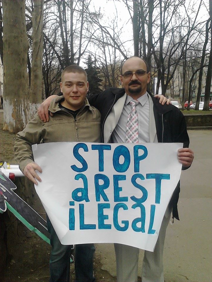 | ‘Stop illegal arrests!’ Grigory Petrenko and other Red Bloc political prisoners outside Riscani Court in Chisinau, Moldova, Feb. 26. Photos: Ritka Sorokin |