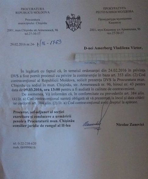 According to Vlada Amerberg, spouse of Mikhail Amerberg, she received a summons from the Municipal Prosecutor’s Office “for her hearing as a trespasser.” She is charged with resisting police officers. She faces a fine of up to 2,000 lei, or 15 days in jail.