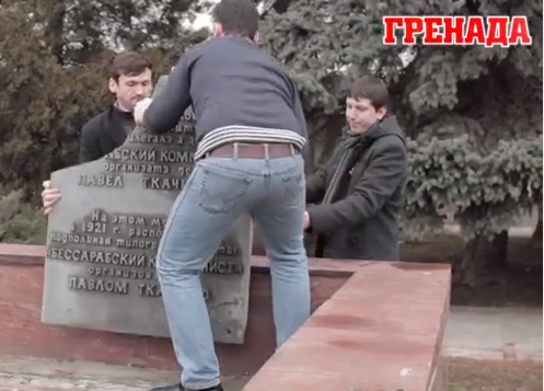 Translator’s note: Since the discovery of the plaque three years ago, the website Grenada.md and activists involved in its recovery have parted ways with the reformist Party of Communists of the Republic of Moldova (PCRM )and today stand with the new communist party Red Bloc (Our Home is Moldova). Grenada editor Pavel Grigorchuk, seen in the video, is a member of the “Petrenko Group” of seven political prisoners currently held under house arrest by the oligarch regime.