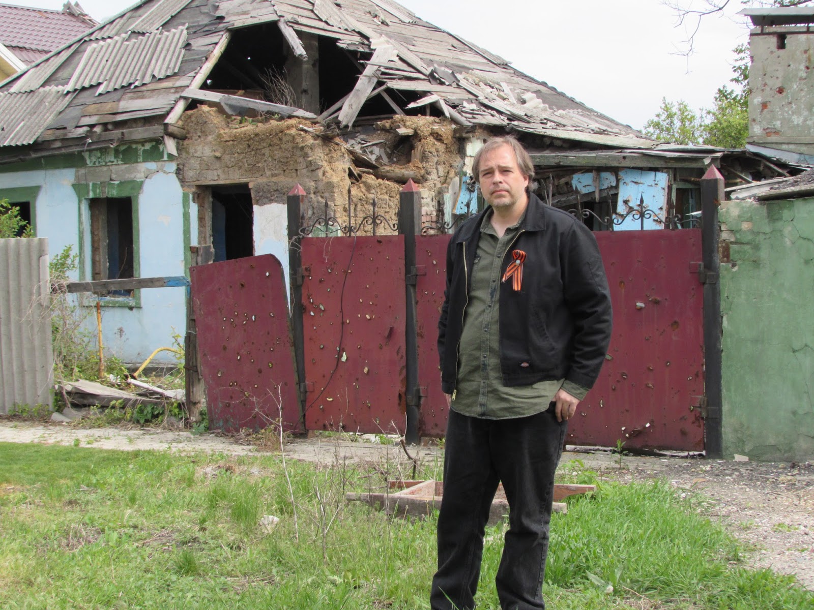 | Reporter Greg Butterfield near wreckage of a shelled home in Oktoberski village, Donetsk. Photo: Janus Putkonen |