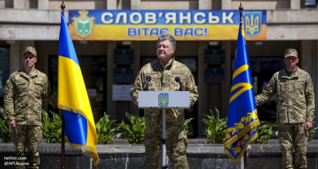 | U.S.-backed Ukrainian President Petro Poroshenko (center) beats the drums of war. |