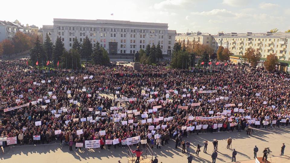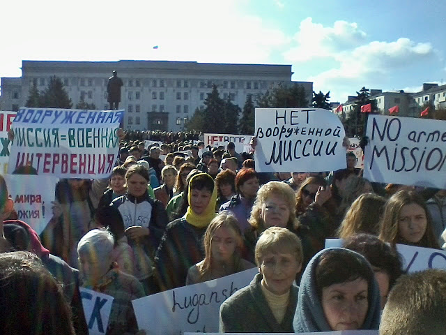 Yesterday, October 10, 2016, a big demonstration was held in Lugansk to say no to any international military mission. [The Kiev regime is calling for the deployment of an armed mission of the Organization of Security and Cooperation in Europe (OSCE) in the Donbass.]