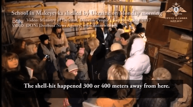 | Students and teachers in bomb shelter after School №32 in Makeyevka was shelled by Ukraine Jan. 30. |