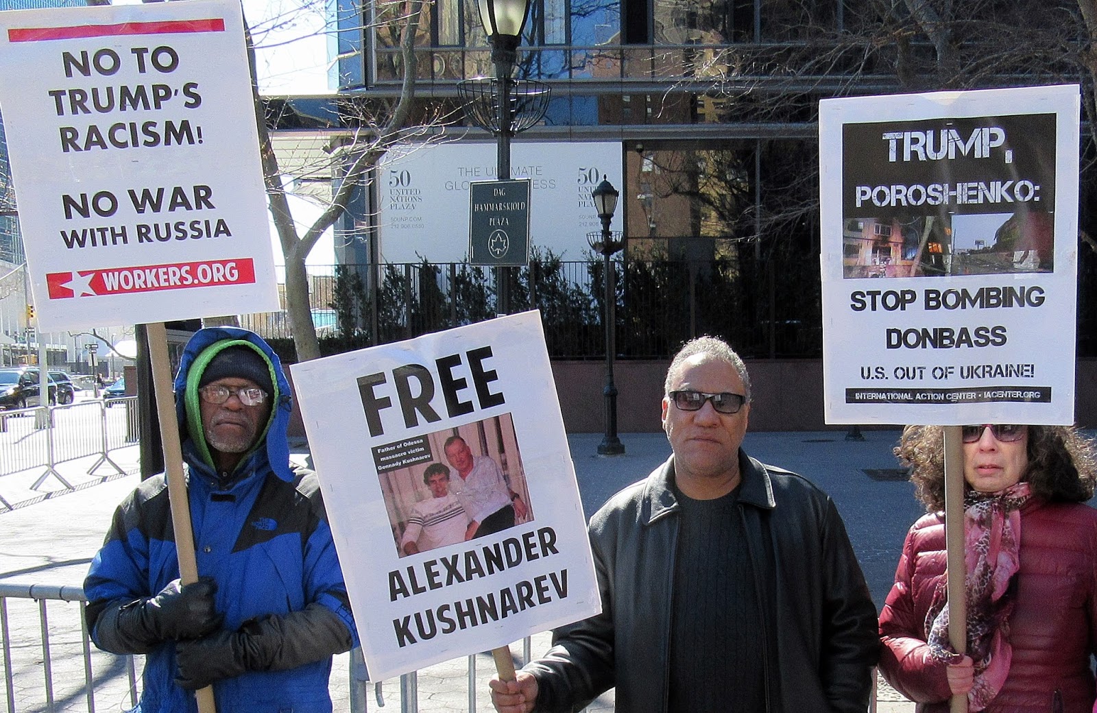 In New York, activists also raised the case of Alexander Kushnarev of Odessa, who was detained by the Kiev regime on Feb. 23. He is the father of Gennady Kushanarev, one of 48 antifascists killed by Ukrainian nationalists on May 2, 2014, at the Odessa House of Trade Unions.