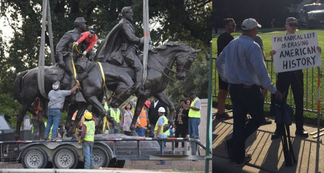 September 16: The equestrian monument of the Confederate slaveholders’ General Robert E. Lee was removed in Dallas. I draw your attention to a remarkable poster held by an opponent of the demolition: “The radical left is erasing American history.”