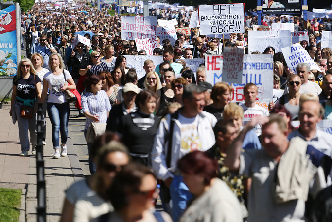 | Tens of thousands in Donetsk protest OSCE plan for foreign “peacekeepers,” June 10, 2016. Washington is now pushing a plan to introduce UN troops. |