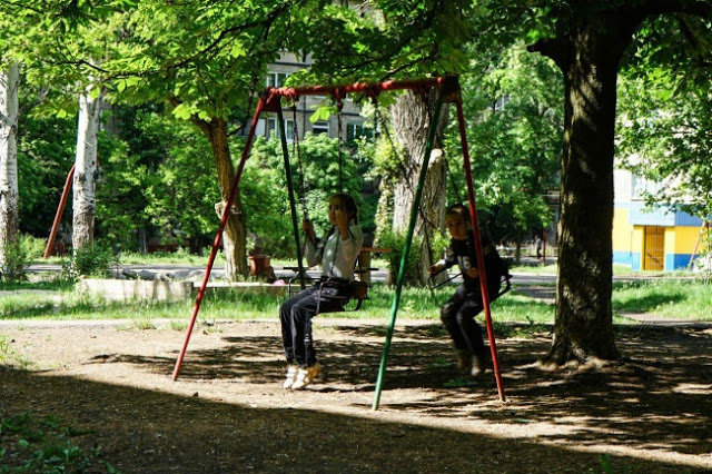 The basement of this house is equipped with a bomb shelter. There are candles and beds. Opposite the entrance there is a children’s playground, where the kids played during a short lull.