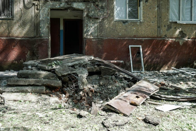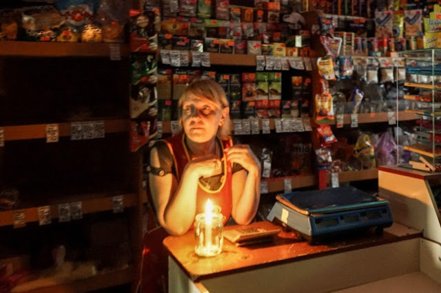 In a local shop, located at the end of the building where the shell hit today, the buyers are sold goods by candlelight. There are several women. They discuss what happened between themselves. They say the same thing that people usually say after shelling: That this has been going on for the fifth year and everyone is tired, that the children are beginning to stutter from the daily horror, that the representatives of the OSCE mission ignore what is happening and do not come to the places that are bombed …