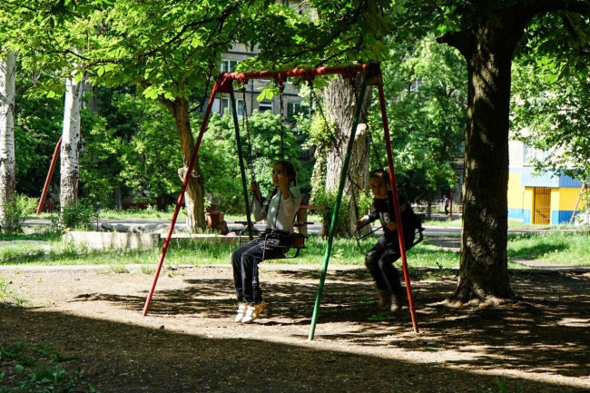 The basement of this house is equipped with a bomb shelter. There are candles and beds. Opposite the entrance there is a children’s playground, where the kids played during a short lull.