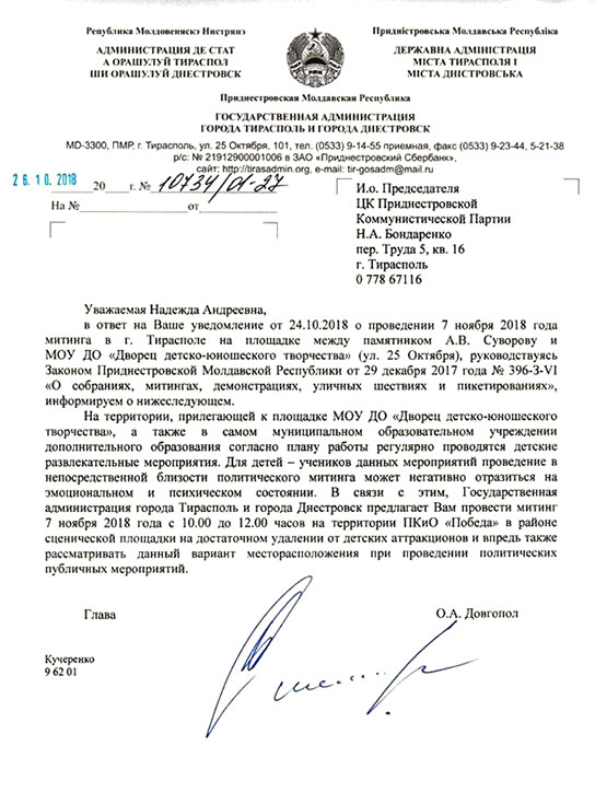 | Document by pro-capitalist regime banning the traditional Nov. 7 rally in Tiraspol. |