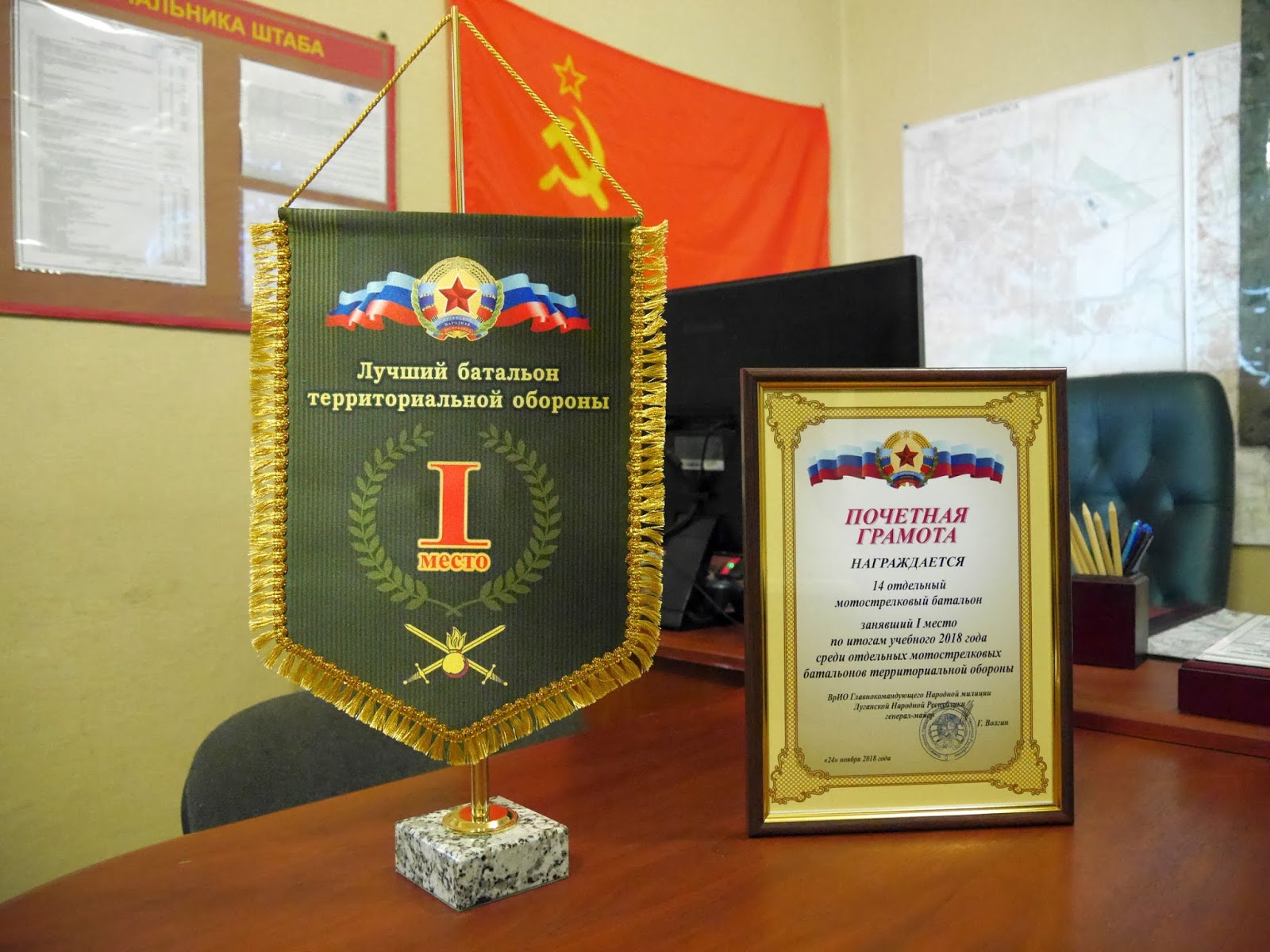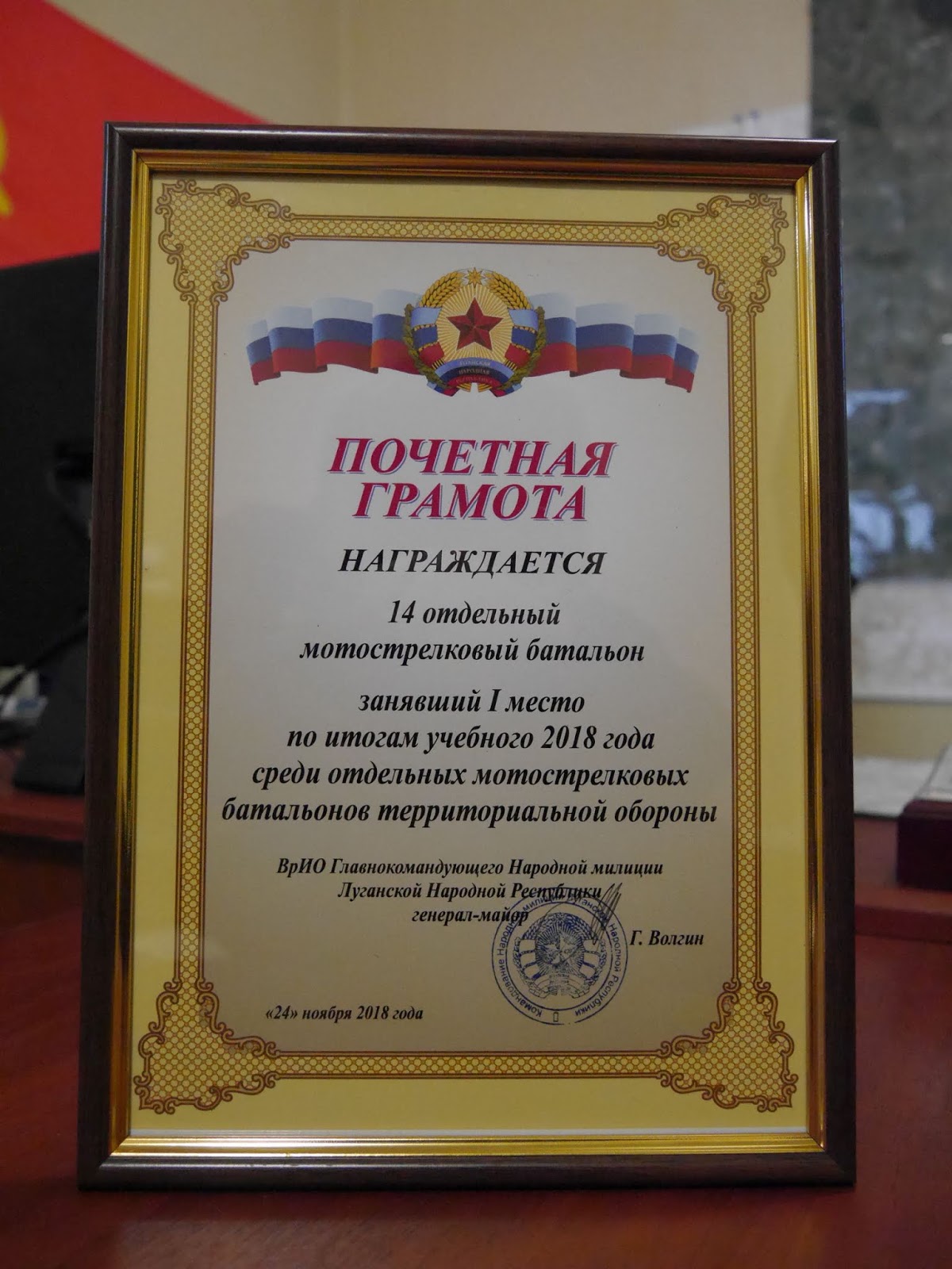 November 26: By order of the commander of the 2nd Army Corps, the 14th separate motorized rifle battalion “Ghost” of the People’s Militia of the Lugansk People’s Republic was recognized as the best territorial defense battalion in 2018 and was awarded a diploma and a pennant.