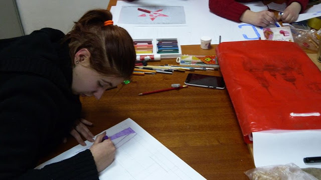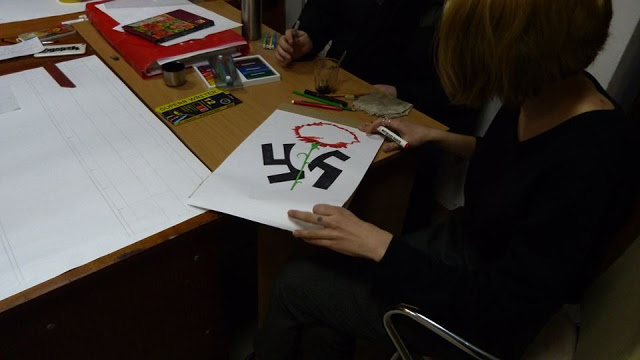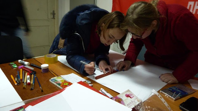 | Comrades from Aurora Women’s Club in Donetsk prepare signs for anti-fascist action on Jan. 19, 2019. |
