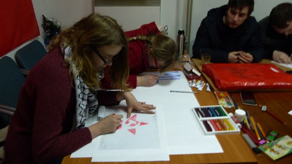 | Comrades from Aurora Women’s Club in Donetsk prepare signs for anti-fascist action on Jan. 19, 2019. |