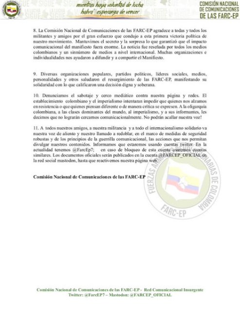 11. To all our friends, to our militants and to all forces of internationalist solidarity, we send our words of encouragement and our call to redouble, in the framework of robust security measures and the principles of guerrilla communication, the actions that allow us to disseminate our views. We inform you that we will be using Twitter accounts. Currently we are using @FarcEp7; in case this account is blocked we will use similar accounts. Official documents will be published on the @FARCEP_OFICIAL account on the Mastodon social network, until we are able to reactivate our website.