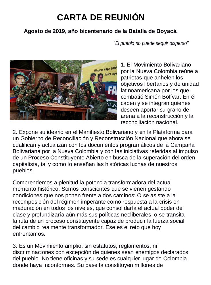 1. The Bolivarian Movement for a New Colombia brings together patriots who yearn for the objectives of liberation for which Simón Bolivar fought. Those who wish to contribute their grain of sand to reconstruction and national reconciliation are included and welcomed.