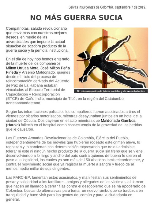 “When we signed the Havana Agreement, we did it with the conviction that it was possible to change the lives of the humble and the dispossessed. But the state has not fulfilled even the most important of its obligations, which is to guarantee the lives of its citizens, and particularly to prevent murder for political reasons. All this: the trap, the betrayal and the perfidy, the unilateral modification of the text of the agreement, the breach of the commitments on the part of the state, the judicial assemblies and the legal insecurity, forced us to return to the mountains…. History will record in its pages that we were forced to retake our weapons.”