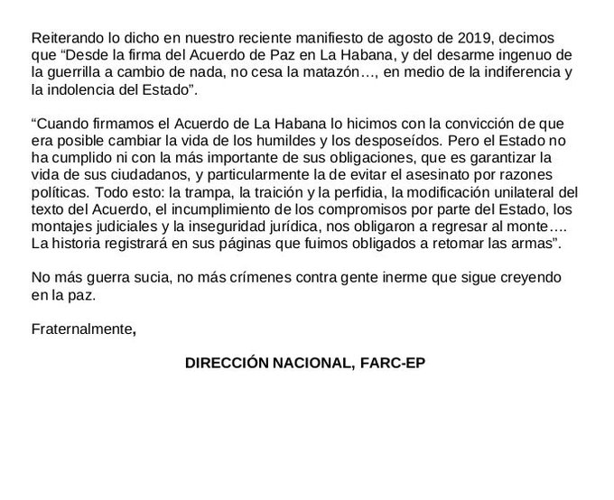 “When we signed the Havana Agreement, we did it with the conviction that it was possible to change the lives of the humble and the dispossessed. But the state has not fulfilled even the most important of its obligations, which is to guarantee the lives of its citizens, and particularly to prevent murder for political reasons. All this: the trap, the betrayal and the perfidy, the unilateral modification of the text of the agreement, the breach of the commitments on the part of the state, the judicial assemblies and the legal insecurity, forced us to return to the mountains…. History will record in its pages that we were forced to retake our weapons.”
