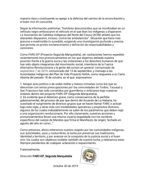 “1. No political or military act or crimes such as those reported with serious concerns by the communities of Toribio, Tacueyo and San Francisco have been committed by guerrillas or militiamen under our orders within the project of the FARC-EP (Second Marquetalia).