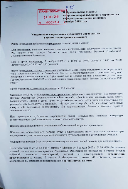 On October 24, representatives of communist and left-wing organizations filed a notice to the Moscow Mayor’s Office about the march and rally for Revolution Day on November 7.