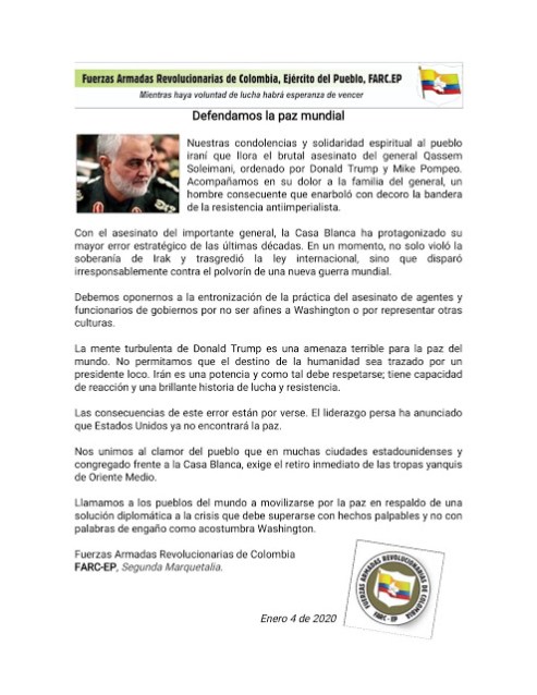Our condolences and solidarity to the Iranian people who mourn the brutal murder of General Qassem Soleimani, ordered by Donald Trump and Mike Pompeo. We share in the sorrow of the family of the general, an unswerving man who raised the flag of anti-imperialist resistance with dignity.