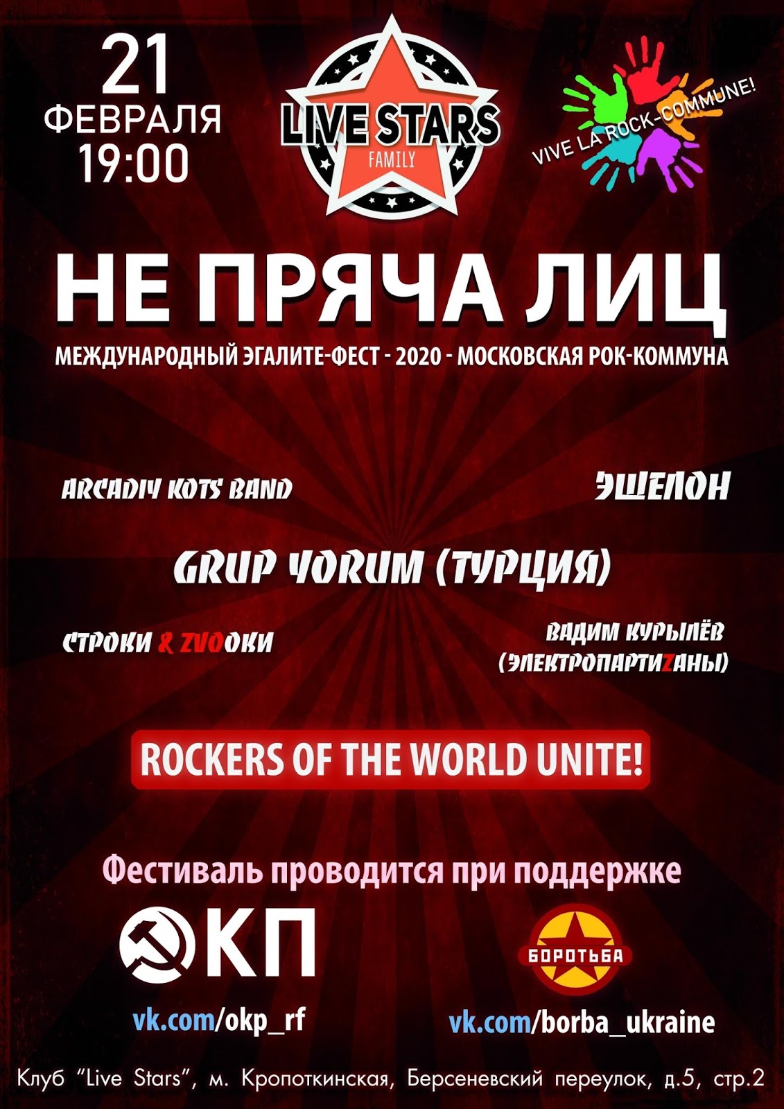 The concert will be dedicated to international solidarity, the struggle of our comrades from different countries. Hear beloved struggle-rockers and new hits, songs from Kurdistan, Cuba, Turkey, Chile. Our festival is the music of resistance, the music of revolution and love!