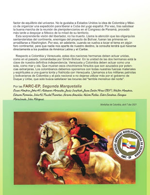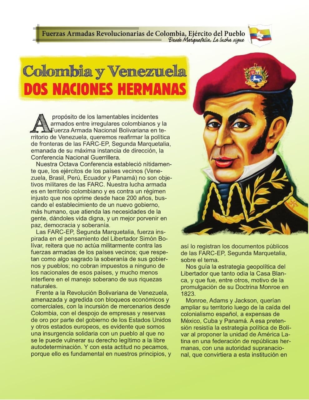 Respecto a Colombia y Venezuela, estas dos naciones hermanas deben actuar unidas, como en el pasado, comandadas por Simón Bolívar. En la unidad de las dos hermanas está la clave de nuestra definitiva independencia. Venezuela y Colombia deben actuar como una sola, como mar y ola. Que mueran esos chovinismos hirsutos que son azuzados por potencias extranjeras. Los colombianos debemos oponernos con todas nuestras fuerzas materiales y espirituales a una guerra tonta y fratricida con Venezuela. Llamamos a los militares patriotas y bolivarianos de Colombia y al país nacional a no dejarse utilizar más por el gobierno de Duque y Uribe, que solo busca satisfacer las locuras del «terrible monstruo del norte».