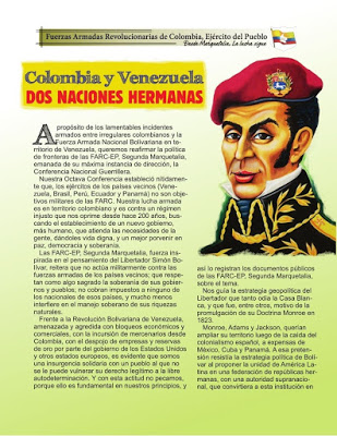 Frente a la Revolución Bolivariana de Venezuela, amenazada y agredida con bloqueos económicos y comerciales, con la incursión de mercenarios desde Colombia, con el despojo de empresas y reservas de oro por parte del gobierno de los Estados Unidos y otros estados europeos, es evidente que somos una insurgencia solidaria con un pueblo al que no se le puede vulnerar su derecho legítimo a la libre autodeterminación. Y con esta actitud no pecamos, porque ello es fundamental en nuestros principios, y así lo registran los documentos públicos de las FARC-EP, Segunda Marquetalia, sobre el tema.